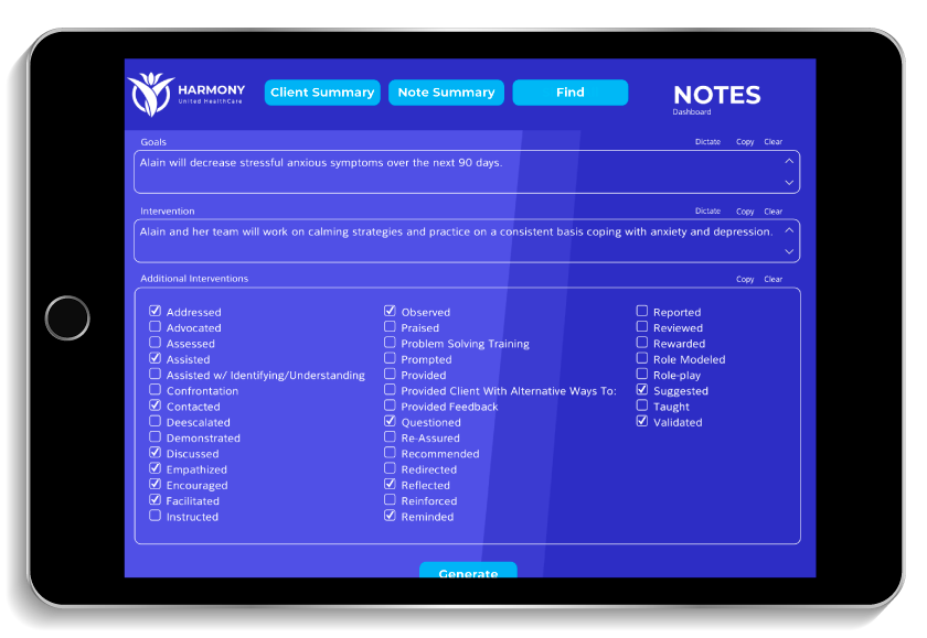 Harmony United Healthcare approached us with a major challenge: clinicians were spending 30+ minutes per patient drafting detailed PIE/SOAP notes for Electronic Health Records (EHRs). With a growing caseload and strict documentation requirements, valuable hours were being drained from their workweek—time that could be spent serving patients, not screens.